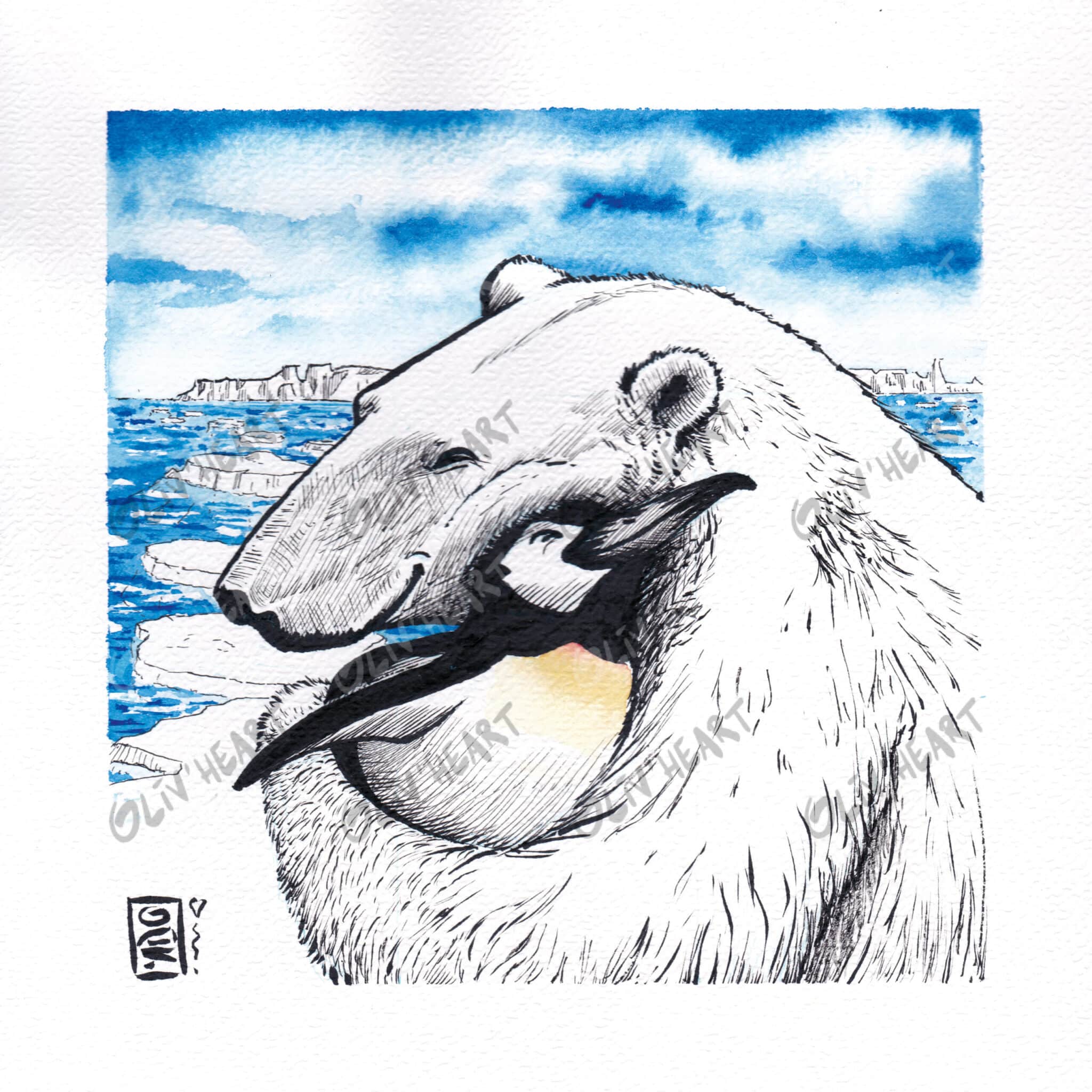 Ours polaire et manchot font un gros câlin sur fond de banquise
