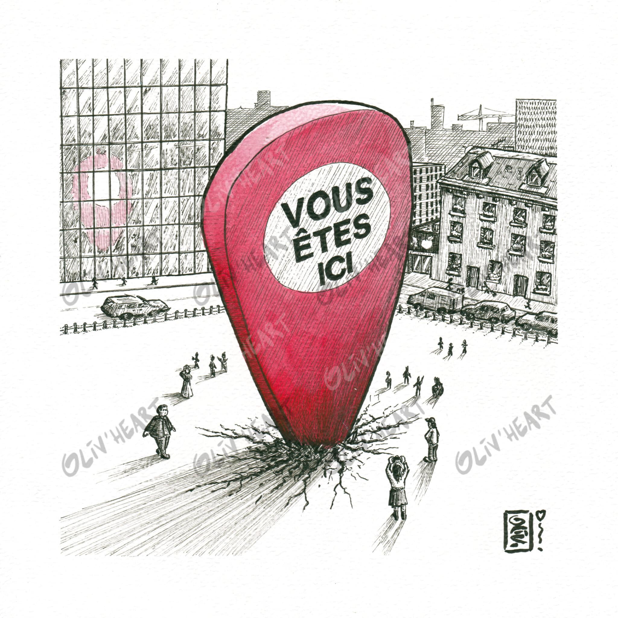 Place de ville avec énorme pointeur « vous êtes ici »