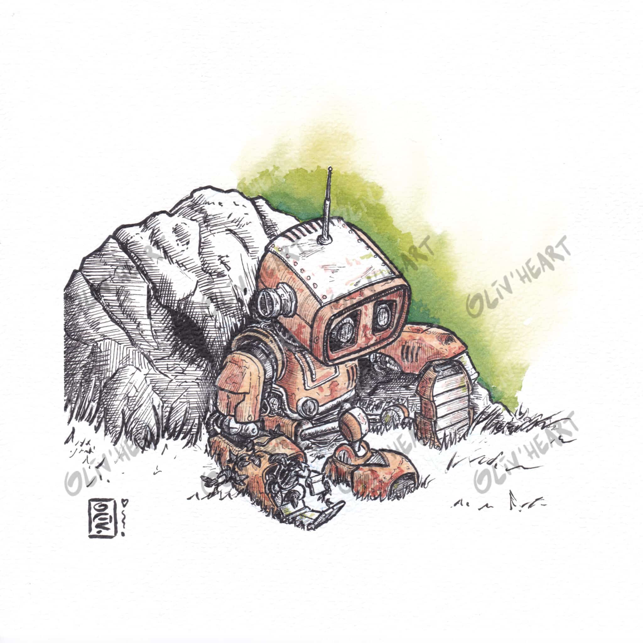 Vieux robot rouillé adossé à un rocher